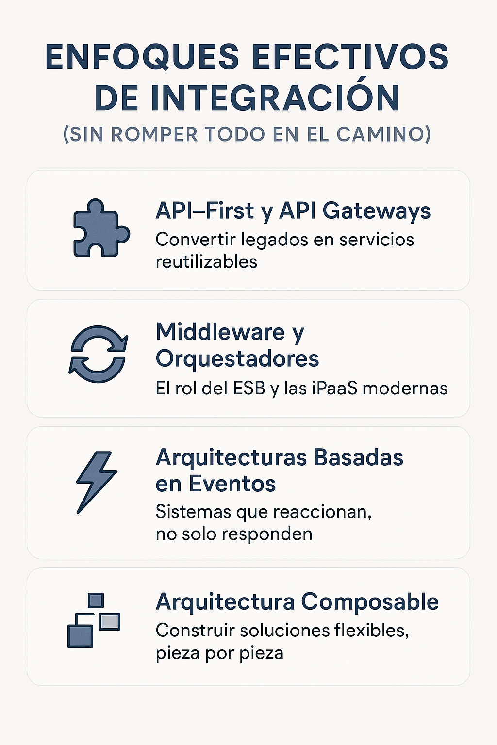 Estas estrategias no son excluyentes. De hecho, en muchos proyectos exitosos se combinan: se encapsula un sistema heredado con una API, se conecta mediante una iPaaS y se incorpora en una Arquitectura Composable basada en eventos.